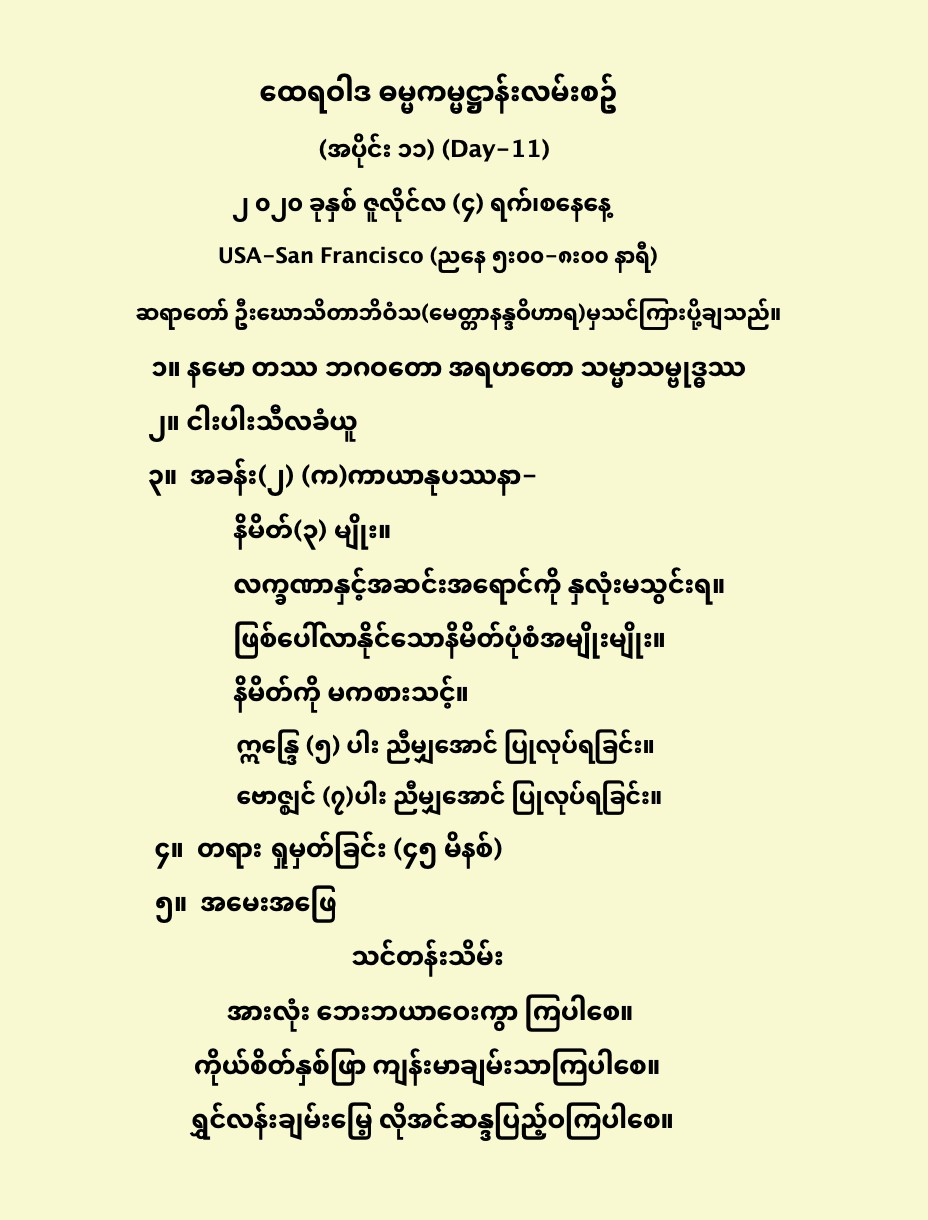 ထေရဝါဒ ဓမ္မကမ္မဌာန်း လမ်းစဥ် အပိုင်း(၁၁) July 4, 2020 / ညနေ သဘောတရားရေးရာအပိုင်း, ထေရဝါဒ ဓမ္မကမ္မဌာန်း လမ်းစဥ် အပိုင်း(၁၁) Day 11 နမော တဿ ဘဂဝတော အရဟတော သမ္မာသမ္ဗုဒ္ဓဿ (သုံးကြိမ်) သင်တန်း တရား ရှုမှတ်ခြင်း နှင့် တရားသိမ်းသင်တန်းမှတ်စုများ Downloads https://www.facebook.com/maungkyi.shein/videos/2644597025778284