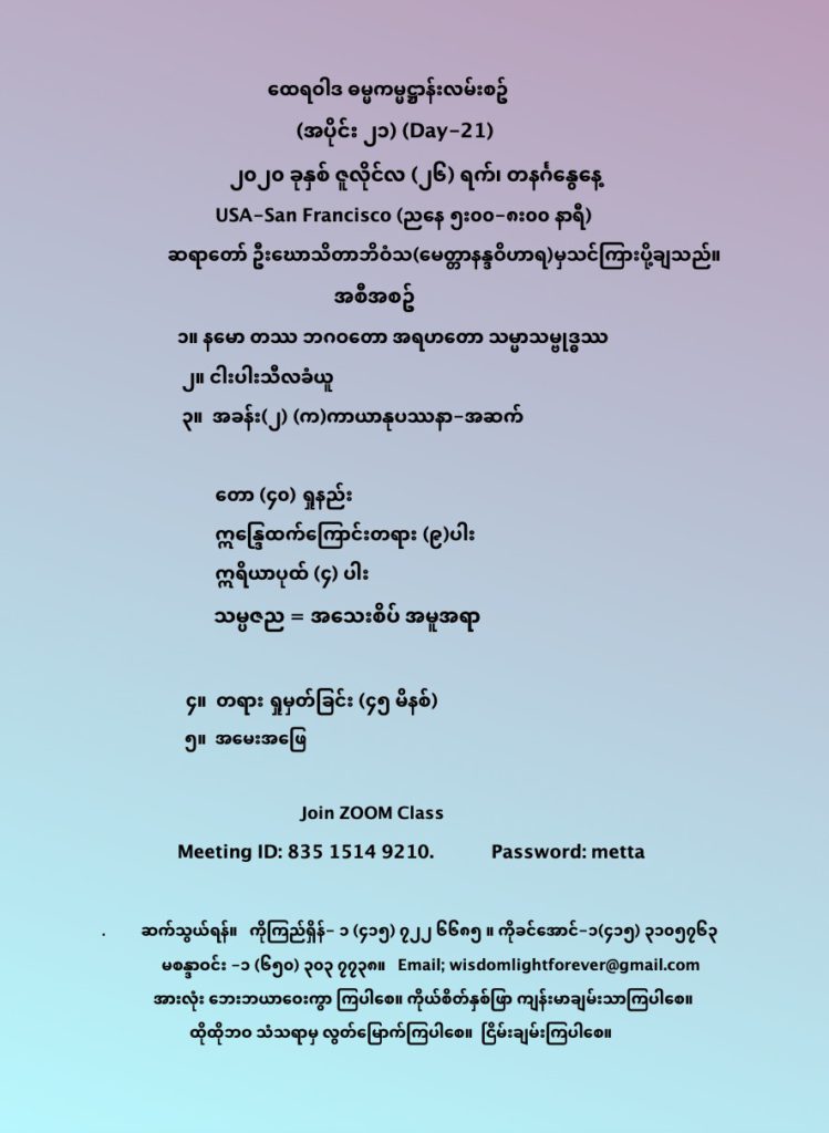 ထေရဝါဒ ဓမ္မကမ္မဌာန်း လမ်းစဥ် အပိုင်း(၂၁) July 26, 2020 / ညနေ သဘောတရားရေးရာအပိုင်း, ထေရဝါဒ ဓမ္မကမ္မဌာန်း လမ်းစဥ် အပိုင်း(၂၁) Day 21 နမော တဿ ဘဂဝတော အရဟတော သမ္မာသမ္ဗုဒ္ဓဿ (သုံးကြိမ်) သင်တန်း တရား ရှုမှတ်ခြင်း နှင့် တရားသိမ်းသင်တန်းမှတ်စုများ Downloads https://www.facebook.com/maungkyi.shein/videos/2663268127244507