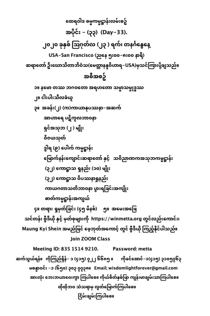 ထေရဝါဒ ဓမ္မကမ္မဌာန်း လမ်းစဥ် အပိုင်း(၃၃) August 23, 2020 / ညနေ သဘောတရားရေးရာအပိုင်း, ထေရဝါဒ ဓမ္မကမ္မဌာန်း လမ်းစဥ် အပိုင်း(၃၃) Day 33 နမော တဿ ဘဂဝတော အရဟတော သမ္မာသမ္ဗုဒ္ဓဿ (သုံးကြိမ်) သင်တန်း တရား ရှုမှတ်ခြင်း နှင့် တရားသိမ်းသင်တန်းမှတ်စုများ Downloads https://www.facebook.com/maungkyi.shein/videos/2687930144778305