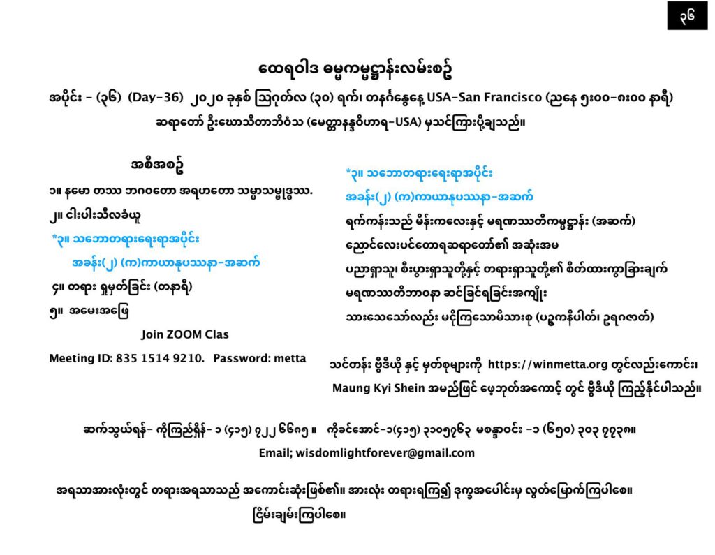ထေရဝါဒ ဓမ္မကမ္မဌာန်း လမ်းစဥ် အပိုင်း(၃၆) August 30, 2020 / ညနေ သဘောတရားရေးရာအပိုင်း, ထေရဝါဒ ဓမ္မကမ္မဌာန်း လမ်းစဥ် အပိုင်း(၃၆) Day 36 နမော တဿ ဘဂဝတော အရဟတော သမ္မာသမ္ဗုဒ္ဓဿ (သုံးကြိမ်) သင်တန်း တရား ရှုမှတ်ခြင်း နှင့် တရားသိမ်းသင်တန်းမှတ်စုများ Downloads https://www.facebook.com/maungkyi.shein/videos/2694259207478732