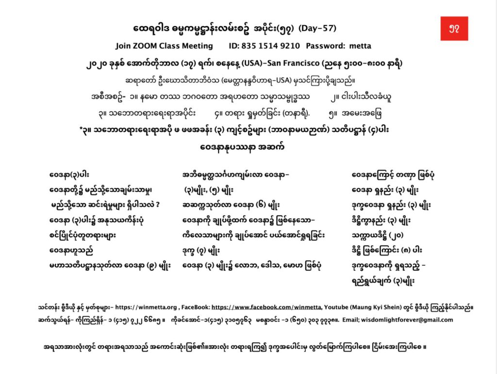 ထေရဝါဒ ဓမ္မကမ္မဌာန်း လမ်းစဥ် အပိုင်း(၅၇) October 18, 2020 / ညနေ သဘောတရားရေးရာအပိုင်း, ထေရဝါဒ ဓမ္မကမ္မဌာန်း လမ်းစဥ် အပိုင်း(၅၇) Day 57 နမော တဿ ဘဂဝတော အရဟတော သမ္မာသမ္ဗုဒ္ဓဿ (သုံးကြိမ်) သင်တန်း တရား ရှုမှတ်ခြင်း နှင့် တရားသိမ်းသင်တန်းမှတ်စုများ Downloads https://www.facebook.com/winmetta/videos/3415859341836164/