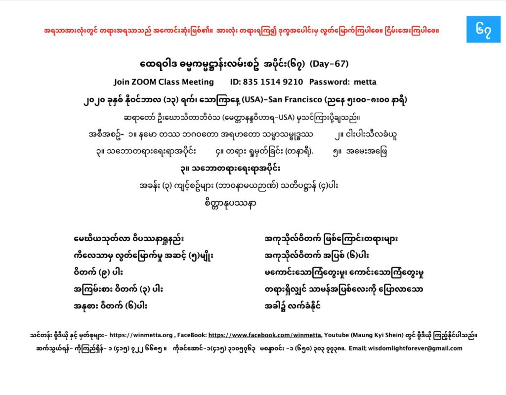ထေရဝါဒ ဓမ္မကမ္မဌာန်း လမ်းစဥ် အပိုင်း(၆၇) November 13, 2020 / ညနေ သဘောတရားရေးရာအပိုင်း, ထေရဝါဒ ဓမ္မကမ္မဌာန်း လမ်းစဥ် အပိုင်း(၆၇) Day 67 နမော တဿ ဘဂဝတော အရဟတော သမ္မာသမ္ဗုဒ္ဓဿ (သုံးကြိမ်) သင်တန်း တရား ရှုမှတ်ခြင်း နှင့် တရားသိမ်းသင်တန်းမှတ်စုများ Downloads https://www.facebook.com/winmetta/videos/694706751444621/