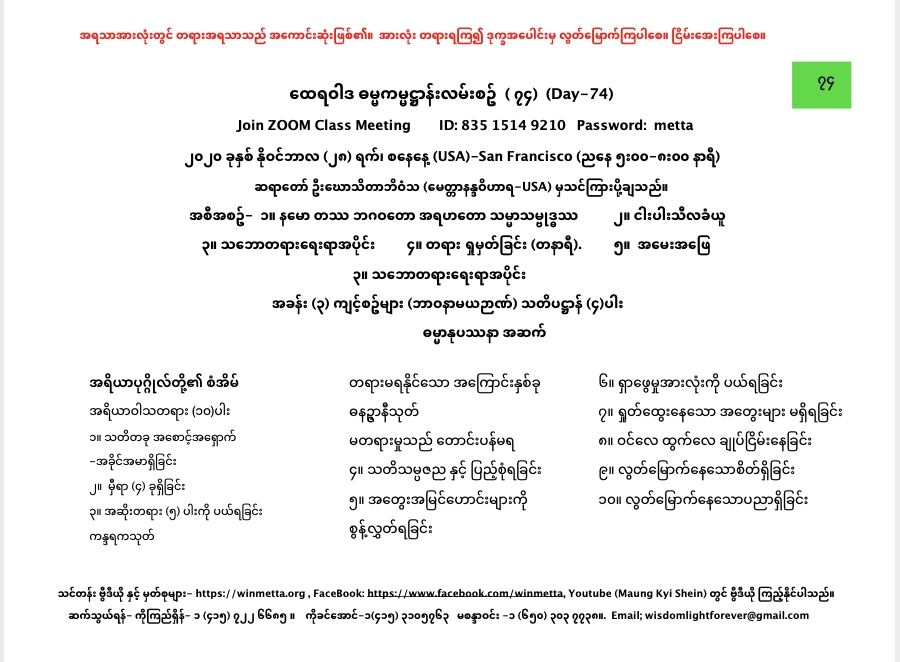 ထေရဝါဒ ဓမ္မကမ္မဌာန်း လမ်းစဥ် အပိုင်း(၇၄) November 28, 2020 / ညနေ သဘောတရားရေးရာအပိုင်း, ထေရဝါဒ ဓမ္မကမ္မဌာန်း လမ်းစဥ် အပိုင်း(၇၄) Day 74 နမော တဿ ဘဂဝတော အရဟတော သမ္မာသမ္ဗုဒ္ဓဿ (သုံးကြိမ်) သင်တန်း တရား ရှုမှတ်ခြင်း နှင့် တရားသိမ်းသင်တန်းမှတ်စုများ Downloads