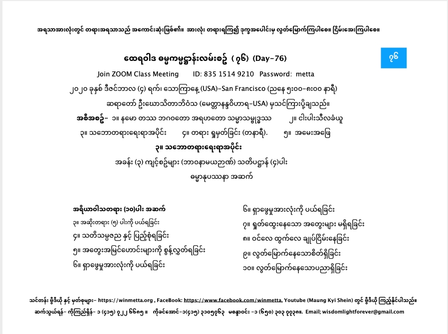 ထေရဝါဒ ဓမ္မကမ္မဌာန်း လမ်းစဥ် အပိုင်း(၇၆) December 4, 2020 / ညနေ သဘောတရားရေးရာအပိုင်း, ထေရဝါဒ ဓမ္မကမ္မဌာန်း လမ်းစဥ် အပိုင်း(၇၆) Day 76 နမော တဿ ဘဂဝတော အရဟတော သမ္မာသမ္ဗုဒ္ဓဿ (သုံးကြိမ်) သင်တန်း တရား ရှုမှတ်ခြင်း နှင့် တရားသိမ်းသင်တန်းမှတ်စုများ Downloads
