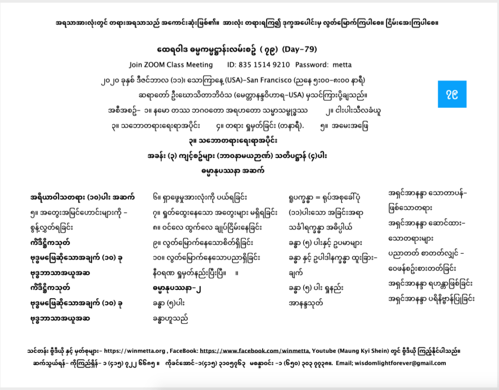 ထေရဝါဒ ဓမ္မကမ္မဌာန်း လမ်းစဥ် အပိုင်း(၇၉) December 11, 2020 / ညနေ သဘောတရားရေးရာအပိုင်း, ထေရဝါဒ ဓမ္မကမ္မဌာန်း လမ်းစဥ် အပိုင်း(၇၉) Day 79 နမော တဿ ဘဂဝတော အရဟတော သမ္မာသမ္ဗုဒ္ဓဿ (သုံးကြိမ်) သင်တန်း တရား ရှုမှတ်ခြင်း နှင့် တရားသိမ်းသင်တန်းမှတ်စုများ Downloads