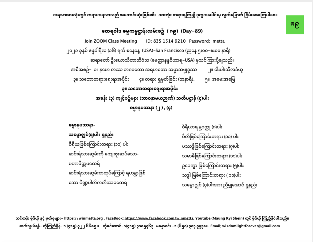 ထေရဝါဒ ဓမ္မကမ္မဌာန်း လမ်းစဥ် အပိုင်း(၈၉) January 16, 2021 / ညနေ သဘောတရားရေးရာအပိုင်း, ထေရဝါဒ ဓမ္မကမ္မဌာန်း လမ်းစဥ် အပိုင်း(၈၉) Day 89 နမော တဿ ဘဂဝတော အရဟတော သမ္မာသမ္ဗုဒ္ဓဿ (သုံးကြိမ်) သင်တန်း တရား ရှုမှတ်ခြင်း နှင့် တရားသိမ်းသင်တန်းမှတ်စုများ Downloads ဗောဇ္ဈင်(၇)ပါးDownload
