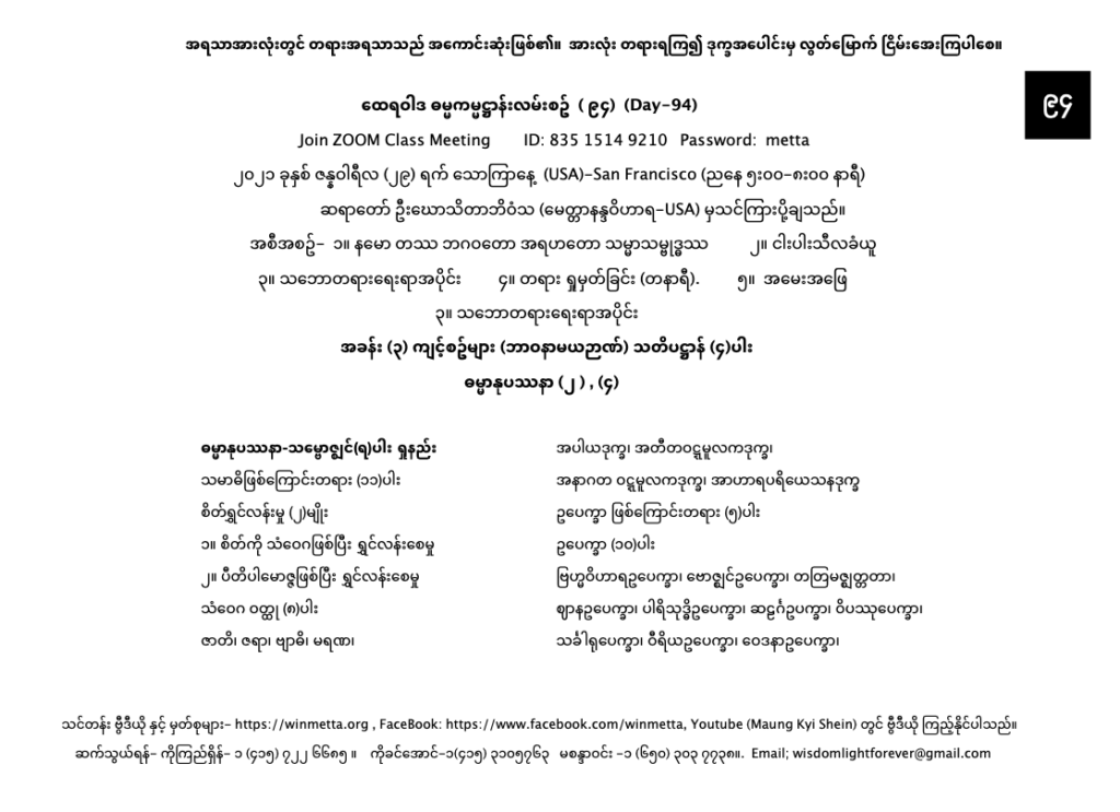 ထေရဝါဒ ဓမ္မကမ္မဌာန်း လမ်းစဥ် အပိုင်း(၉၄) January 29, 2021 / ညနေ သဘောတရားရေးရာအပိုင်း, ထေရဝါဒ ဓမ္မကမ္မဌာန်း လမ်းစဥ် အပိုင်း(၉၄) Day 94 နမော တဿ ဘဂဝတော အရဟတော သမ္မာသမ္ဗုဒ္ဓဿ (သုံးကြိမ်) သင်တန်း တရား ရှုမှတ်ခြင်း နှင့် တရားသိမ်းသင်တန်းမှတ်စုများ Downloads ဗောဇ္ဈင်(၇)ပါးDownload