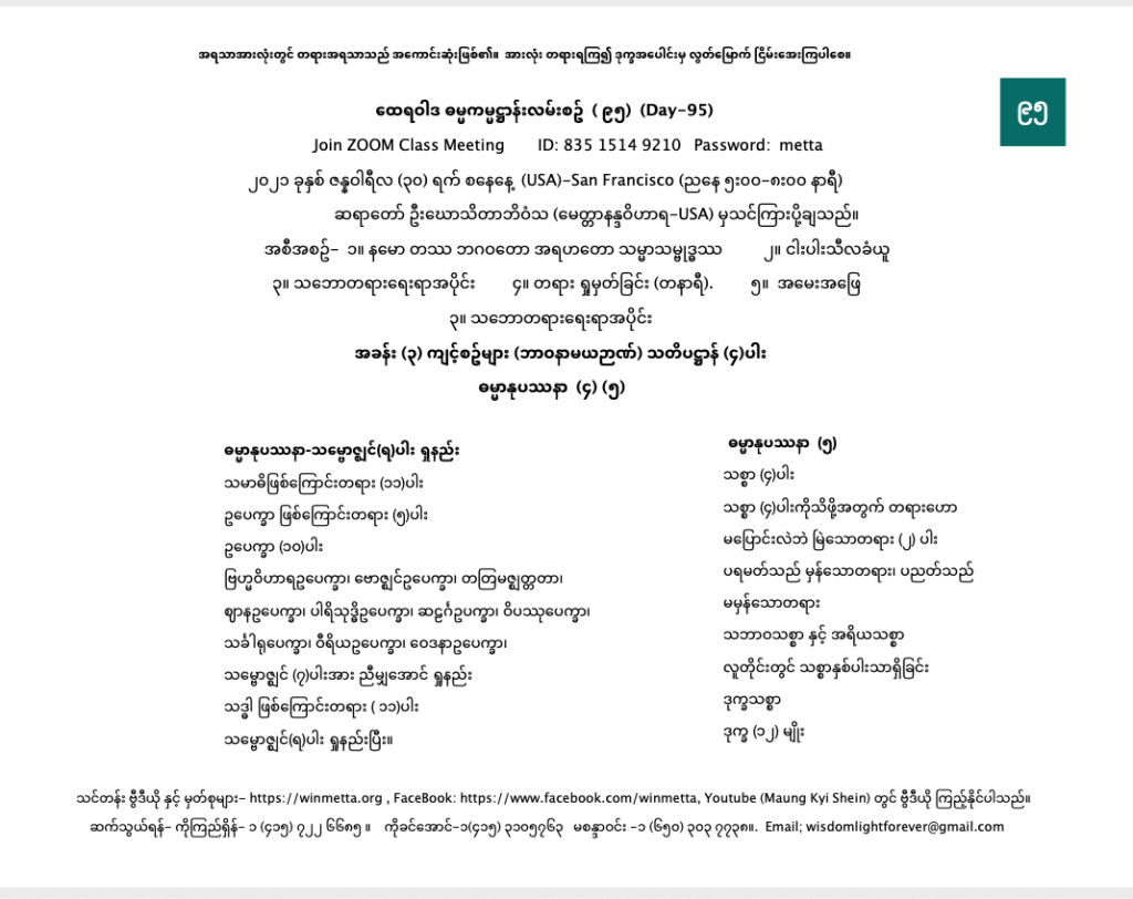 ထေရဝါဒ ဓမ္မကမ္မဌာန်း လမ်းစဥ် အပိုင်း(၉၅) January 30, 2021 / ညနေ သဘောတရားရေးရာအပိုင်း, ထေရဝါဒ ဓမ္မကမ္မဌာန်း လမ်းစဥ် အပိုင်း(၉၅) Day 95 နမော တဿ ဘဂဝတော အရဟတော သမ္မာသမ္ဗုဒ္ဓဿ (သုံးကြိမ်) သင်တန်း တရား ရှုမှတ်ခြင်း နှင့် တရားသိမ်းသင်တန်းမှတ်စုများ Downloads ဗောဇ္ဈင်(၇)ပါးDownload ဥပေက္ခာမျိုး ၁၀-ပါးDownload