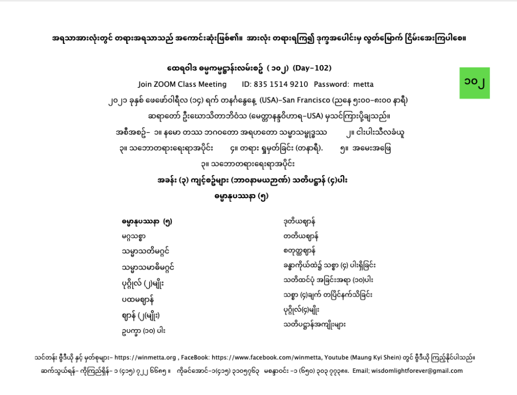 ထေရဝါဒ ဓမ္မကမ္မဌာန်း လမ်းစဥ် အပိုင်း(၁၀၂) February 14, 2021 / ညနေ သဘောတရားရေးရာအပိုင်း, ထေရဝါဒ ဓမ္မကမ္မဌာန်း လမ်းစဥ် အပိုင်း(၁၀၂) Day 102 နမော တဿ ဘဂဝတော အရဟတော သမ္မာသမ္ဗုဒ္ဓဿ (သုံးကြိမ်) သင်တန်း တရား ရှုမှတ်ခြင်း နှင့် တရားသိမ်းသင်တန်းမှတ်စုများ Downloads ဝေဒနာနုပဿနာDownload စိတ္တာနုပဿနာသတိပဋ္ဌာန် (၁၆) မျိုး Download ဓမ္မာနုပဿနာသတိပဋ္ဌာန် (၅) မျိုးDownload ဥပေက္ခာမျိုး ၁၀-ပါးDownload