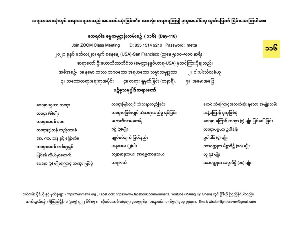 ထေရဝါဒ ဓမ္မကမ္မဌာန်း လမ်းစဥ် အပိုင်း(၁၁၆) March 20, 2021 / ညနေ သဘောတရားရေးရာအပိုင်း, ထေရဝါဒ ဓမ္မကမ္မဌာန်း လမ်းစဥ် အပိုင်း(၁၁၆) Day 116 နမော တဿ ဘဂဝတော အရဟတော သမ္မာသမ္ဗုဒ္ဓဿ (သုံးကြိမ်) သင်တန်း တရား ရှုမှတ်ခြင်း နှင့် တရားသိမ်းသင်တန်းမှတ်စုများ Downloads