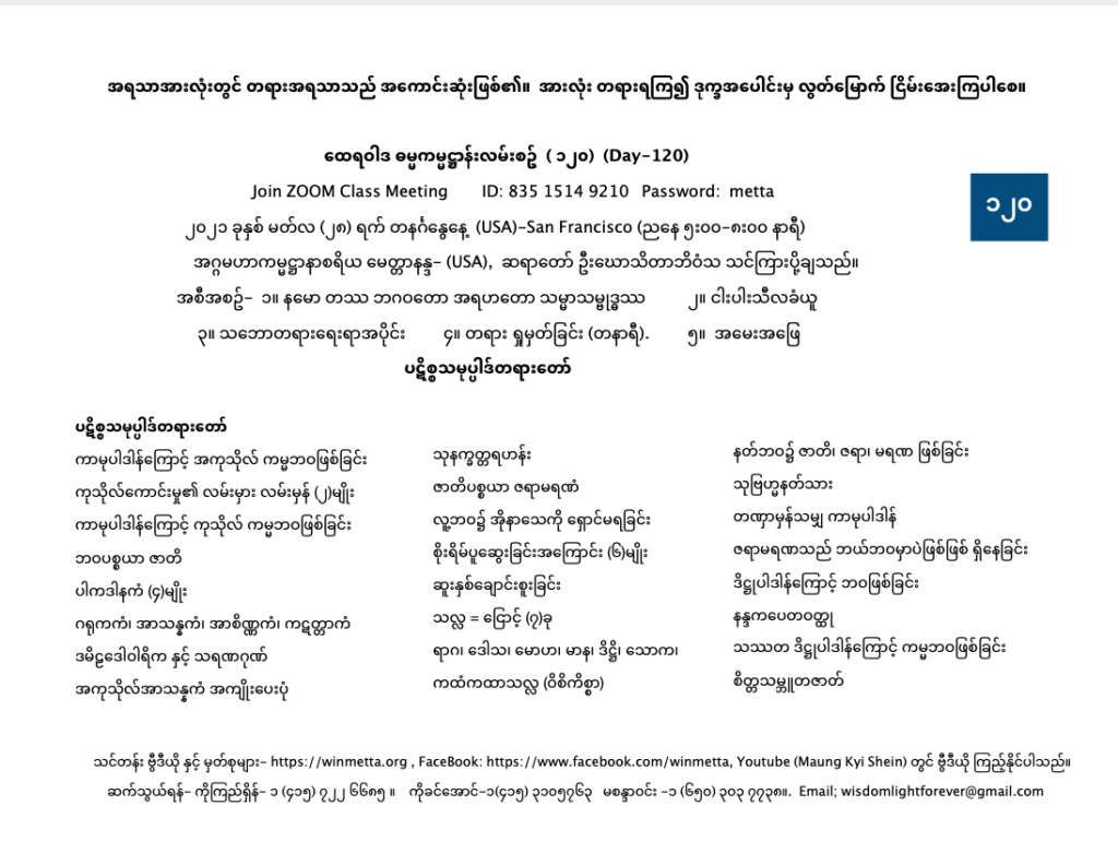 ထေရဝါဒ ဓမ္မကမ္မဌာန်း လမ်းစဥ် အပိုင်း(၁၂၀) March 28, 2021 / ညနေ သဘောတရားရေးရာအပိုင်း, ထေရဝါဒ ဓမ္မကမ္မဌာန်း လမ်းစဥ် အပိုင်း(၁၂၀) Day 120 နမော တဿ ဘဂဝတော အရဟတော သမ္မာသမ္ဗုဒ္ဓဿ (သုံးကြိမ်) သင်တန်း တရား ရှုမှတ်ခြင်း နှင့် တရားသိမ်းသင်တန်းမှတ်စုများ Downloads
