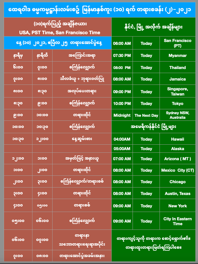 April 25 – ၁၀ရက်ပြည့်နေ့၏ အချိန် အစီအစဥ်ကို အောက်ပါအတိုင်း ပြောင်းထားပါသည်။