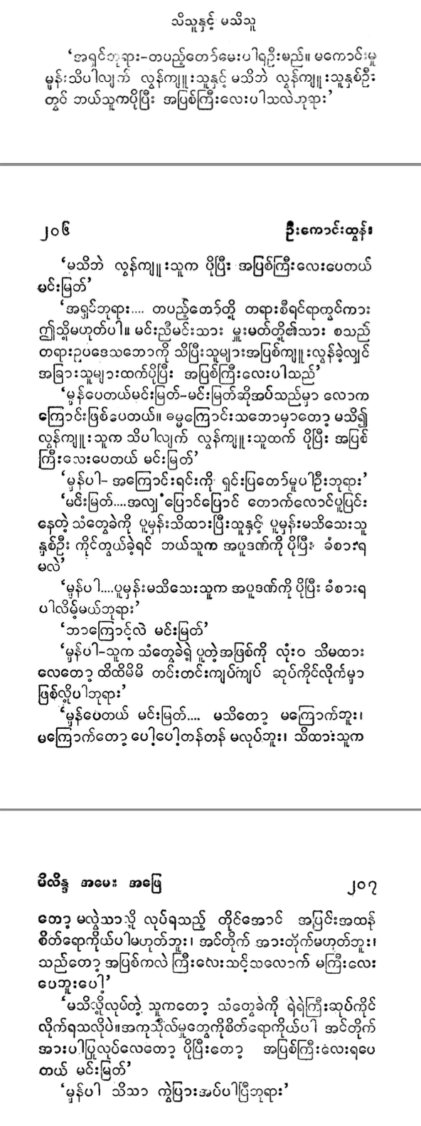“မင်းမြတ်…အလျံပြောင်ပြောင် တောက်လောင်ပူပြင်းနေတဲ့ သံတွေခဲကို ပူမှန်းသိထားပြီးသူနှင့် ပူမှန်းမသိသေးသူ နှစ်ဦး ကိုင်တွယ်ခဲ့ရင် ဘယ်သူက အပူဒဏ်ကို ပိုပြီး ခံစားရမယ်”