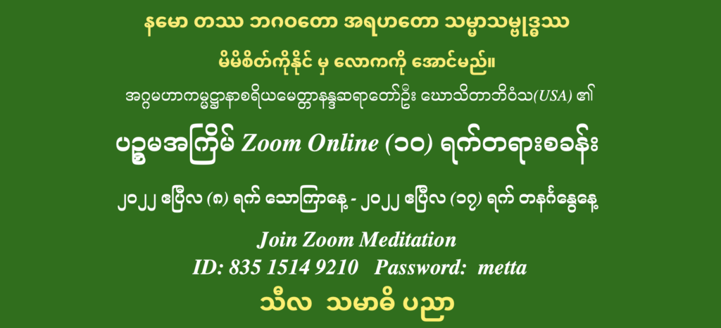 အရေးကြုံလျှင် အသုံးဝင်သည့် ကမ္မဋ္ဌာန်းကျင့်စဥ်၊လောကီ ကို အောင်နိုင်သည့် ကျင့်စဥ်၊ဆင်းရဲခြင်းကင်းစေသည့် ကျင့်စဥ်၊ငြိမ်းချမ်းမှုကို ပေးသည့် ကျင့်စဥ်၊လွတ်မြောက်မှုကို ပေးသည့်ကျင့်စဥ်…..ဟုတ်ကဲ့ပါ။သင်ယူလေ့ကျင့်ကြပါစို့ ။ ။ နမောတဿ ဘဂဝတော အရဟတော သမ္မာသမ္ဗုဒ္ဓဿ။ မိမိစိတ်ကိုနိုင်မှလောကကိုအောင်မည်။ အဂ္ဂမဟာကမ္မဋ္ဌာနာစရိယ မေတ္တာနန္ဒဆရာတော် ဦးဃောသိတာဘိဝံသ(USA) ၏ ပဉ္စမအကြိမ် Zoom Online (၁၀) ရက်တရားစခန်း ၂၀၂၂ ဧပြီလ (၈) ရက်သောကြာနေ့ မှ ၂၀၂၂ ဧပြီလ (၁၇) ရက်တနင်္ဂနွေနေ့ (USA အချိန်) Join Zoom MeditationID: 835 1514 9210 Password: metta သီလ သမာဓိ ပညာ ဆက်သွယ်ရန်ကိုကြည်ရှိန် – ၁ (၄၁၅) ၇၂၂ ၆၆၈၅၊ […]