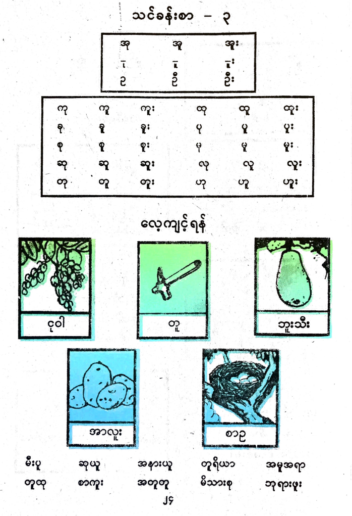 | ဥ (single letter – same sound as အု = အ + ု) egg | ဦ | ဦး Mr. |