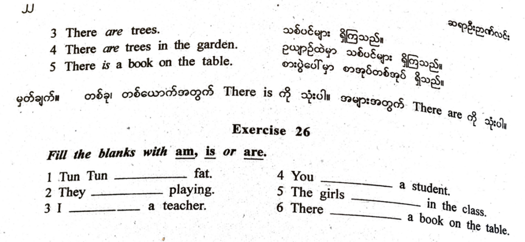 • There + Verb to be + Subject + Prepositional Phrase = ရှိသည်